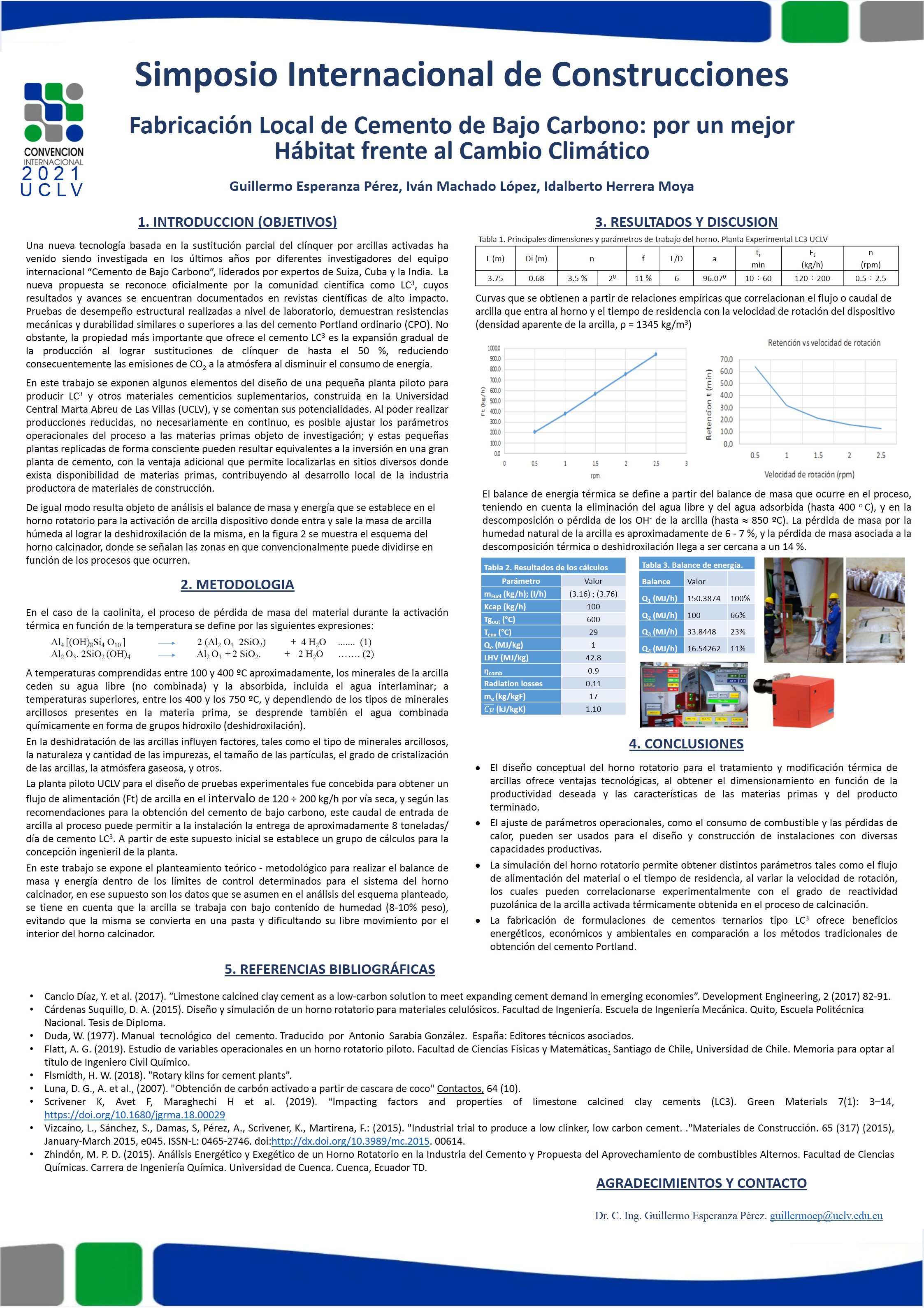 En el presente trabajo se muestran las experiencias cubanas en el montaje, puesta en marcha y operación de una instalación piloto experimental para la producción de LC3 en la Universidad Central Marta Abreu de Las Villas, se describen algunas características del cemento de bajo carbono, se exponen los cálculos necesarios para el diseño mecánico preliminar del horno calcinador rotatorio, considerado el equipo principal de la planta, así como el cálculo de los balances de materiales y energía, y las fuentes de su bajo impacto ambiental, esclareciendo la importante reducción lograda en cuanto a emisiones. Finalmente se reflejan las experiencias de la aplicación de estos materiales cementicios en la fabricación local de materiales de construcción, alcanzándose en las mezclas ensayadas valores de resistencia a la compresión que oscilaron entre 37.5 y 40 MPa para 28 días de envejecimiento.