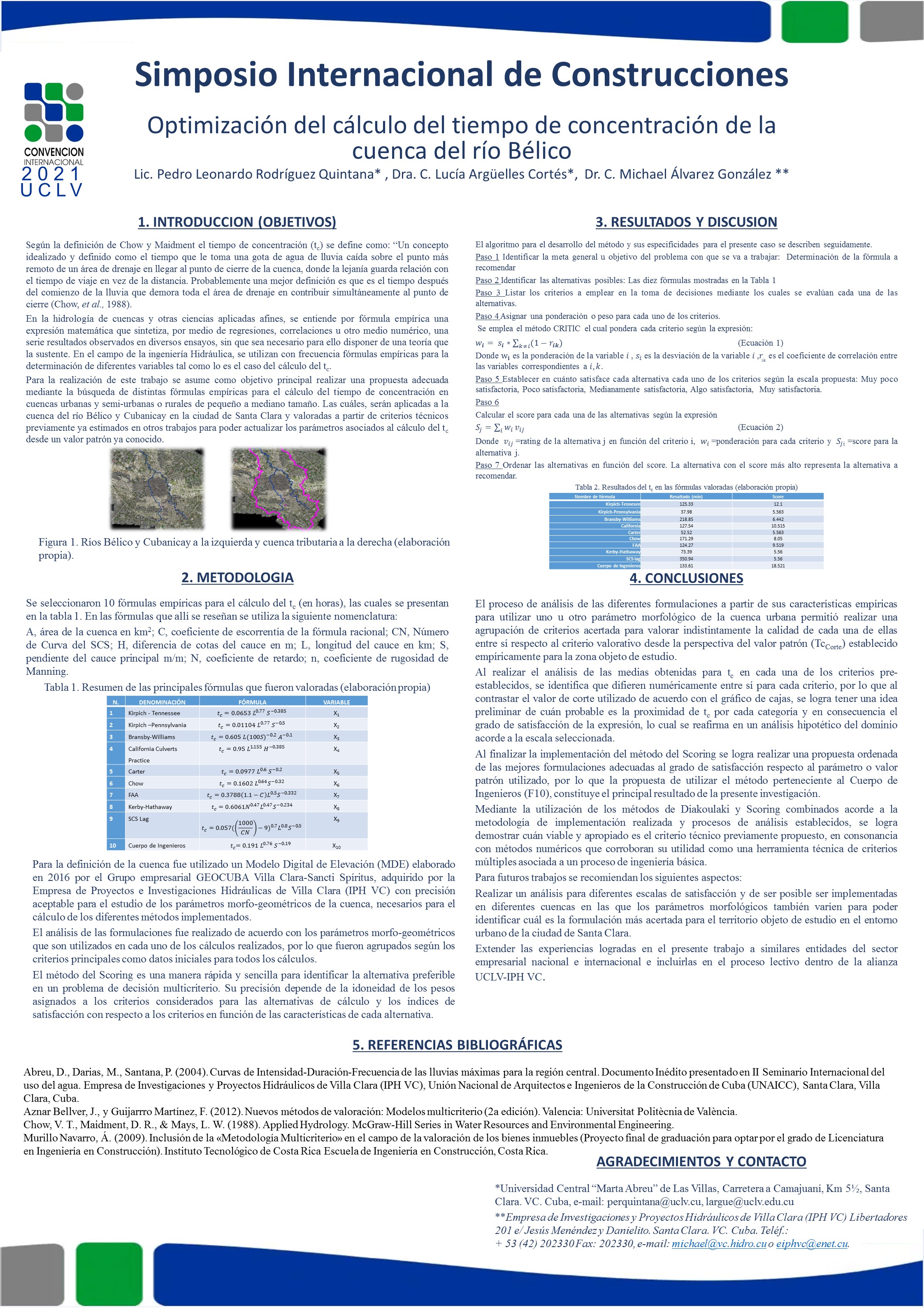El presente trabajo tiene por objetivo proponer la fórmula más representativa para el cálculo del tiempo de concentración de la cuenca urbana del río Bélico en la ciudad de Santa Clara con punto de cierre en la Circunvalación Norte de la ciudad.