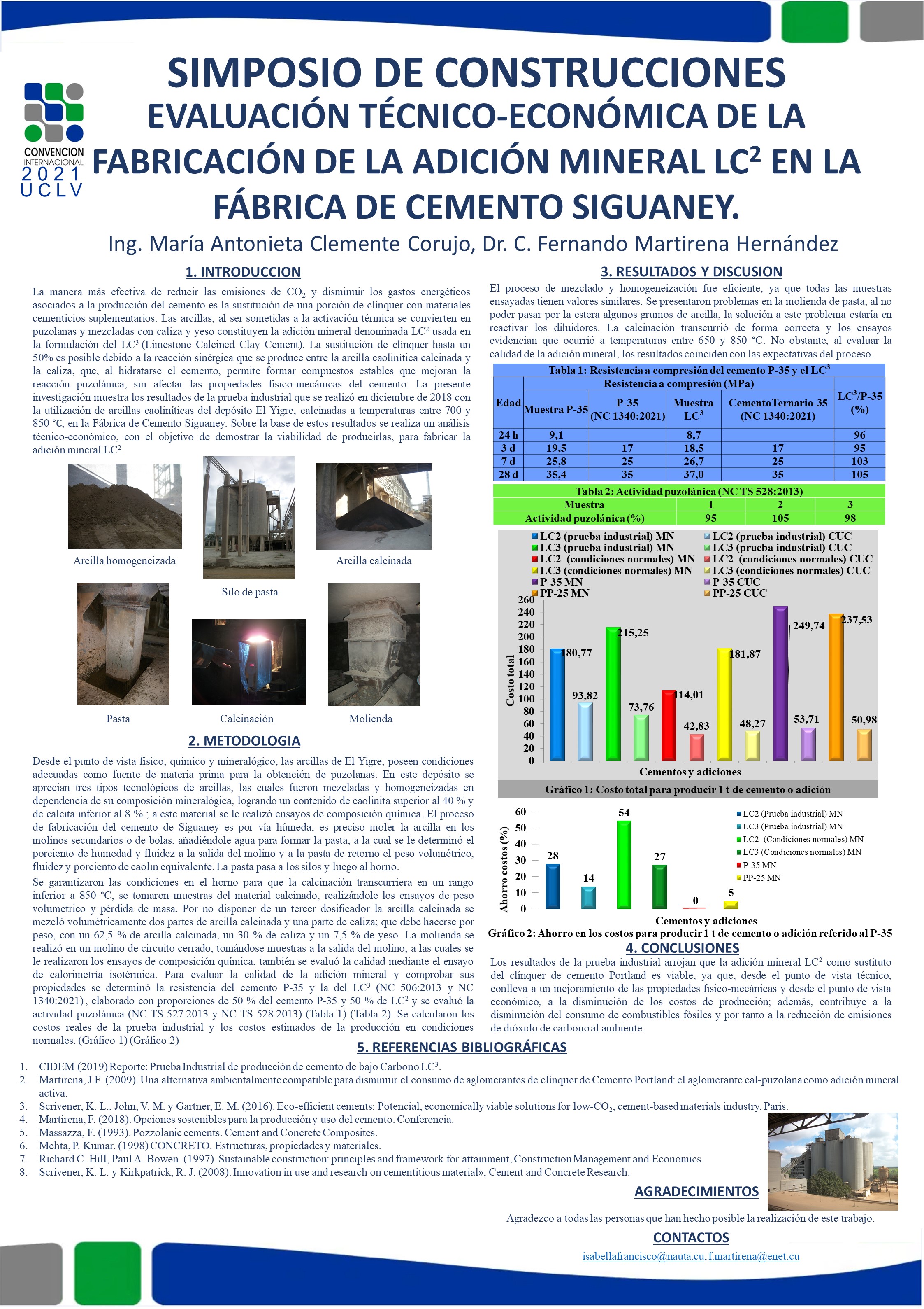 Los resultados arrojan que la adición mineral LC2 como sustituto del clínquer de cemento Portland es viable, ya que, desde el punto de vista técnico, conlleva a un mejoramiento de las propiedades físico-mecánicas y de durabilidad y desde el punto de vista económico, a la disminución de los costos de producción; además, contribuye a la disminución del consumo de combustibles fósiles y la emisión de dióxido de carbono al medio ambiente.