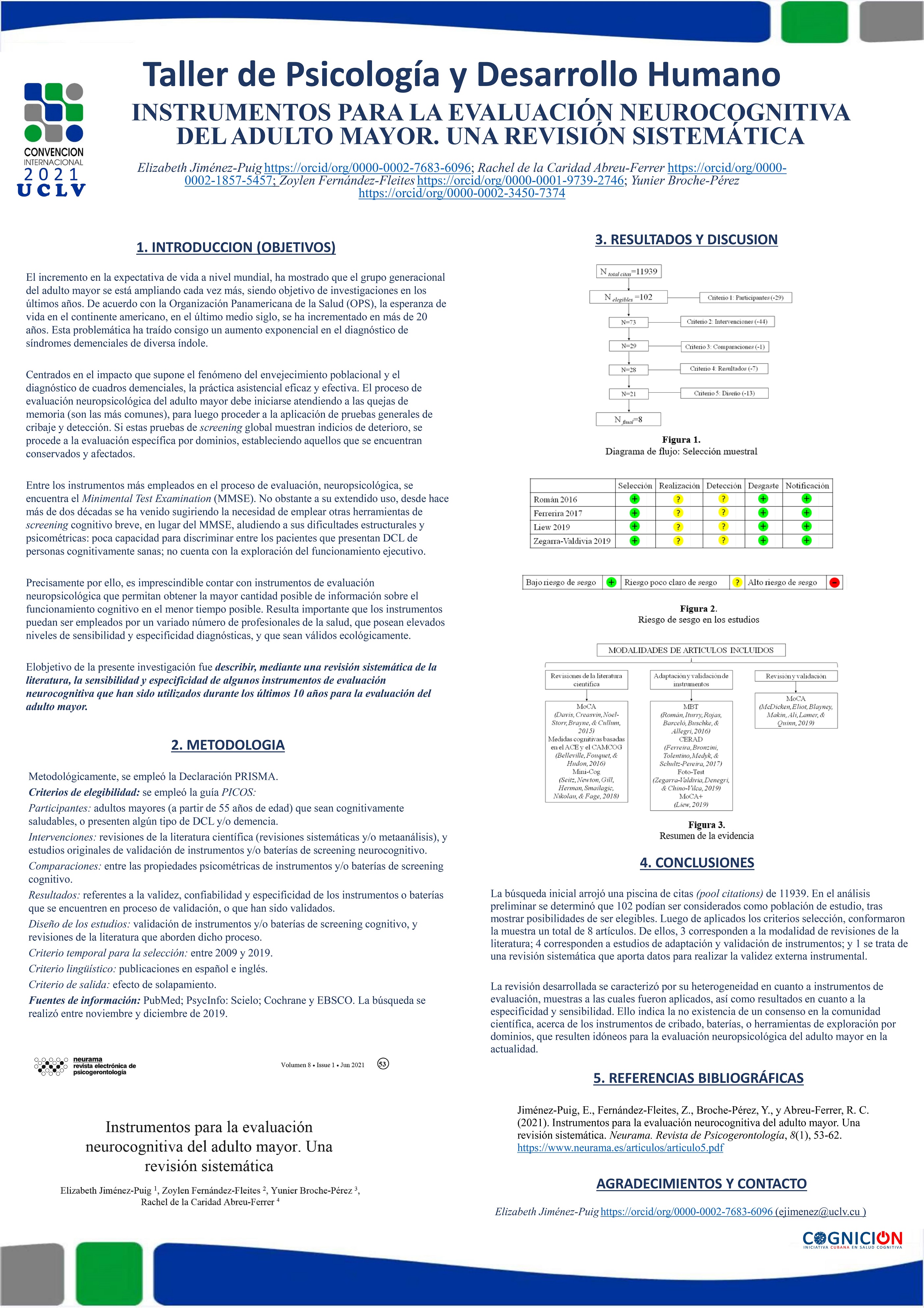 Introducción: El presente estudio se desarrolló con el objetivo de describir, mediante una revisión sistemática de la literatura científica, las propiedades psicométricas de los principales instrumentos de evaluación neuropsicológica que han sido utilizados durante los últimos 10 años para la evaluación neurocognitiva del adulto mayor.