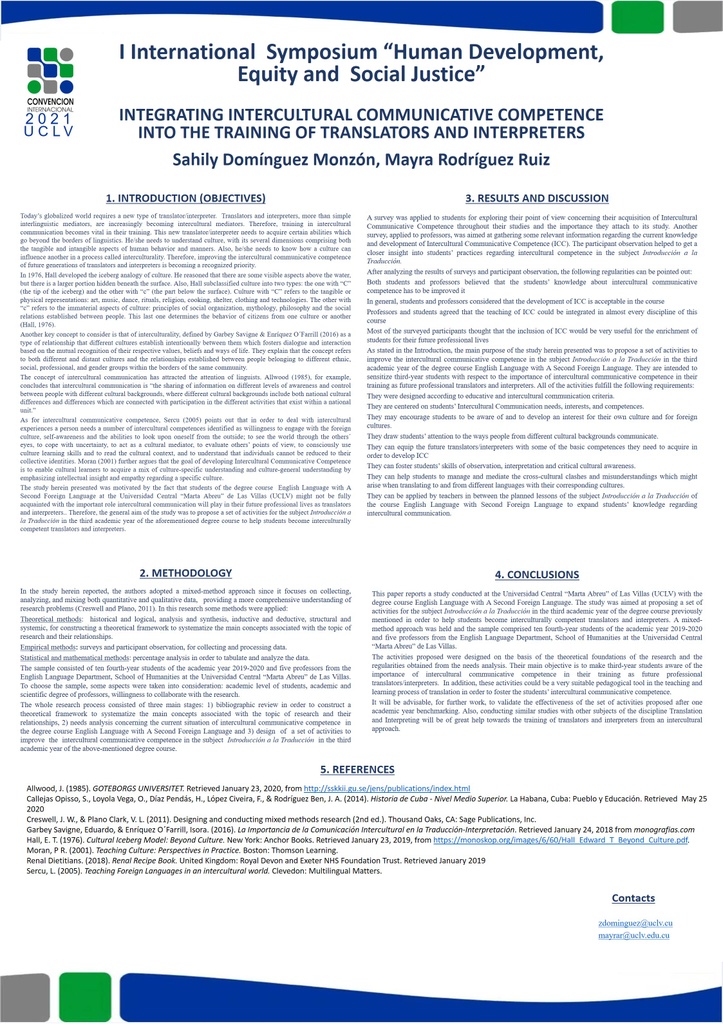 The Intercultural Communicative Competence (ICC) is an essential tool in the English Language teaching and learning process, particularly in the training of translators and interpreters. In today’s globalized world, the translator/interpreter needs to acquire a certain level of intercultural communicative competence (ICC) in order to function as a bridge between different sociocultural groups, minimizing the effects of cultural misunderstandings. This paper reports on a study carried out at the Universidad Central ¨Marta Abreu¨ de Las Villas with students of the degree course English Language with A Second Foreign Language. Its main objective is to propose a set of activities for the subject Introducción a la Traducción in the third academic year of this degree course so that students become interculturally competent translators and interpreters.