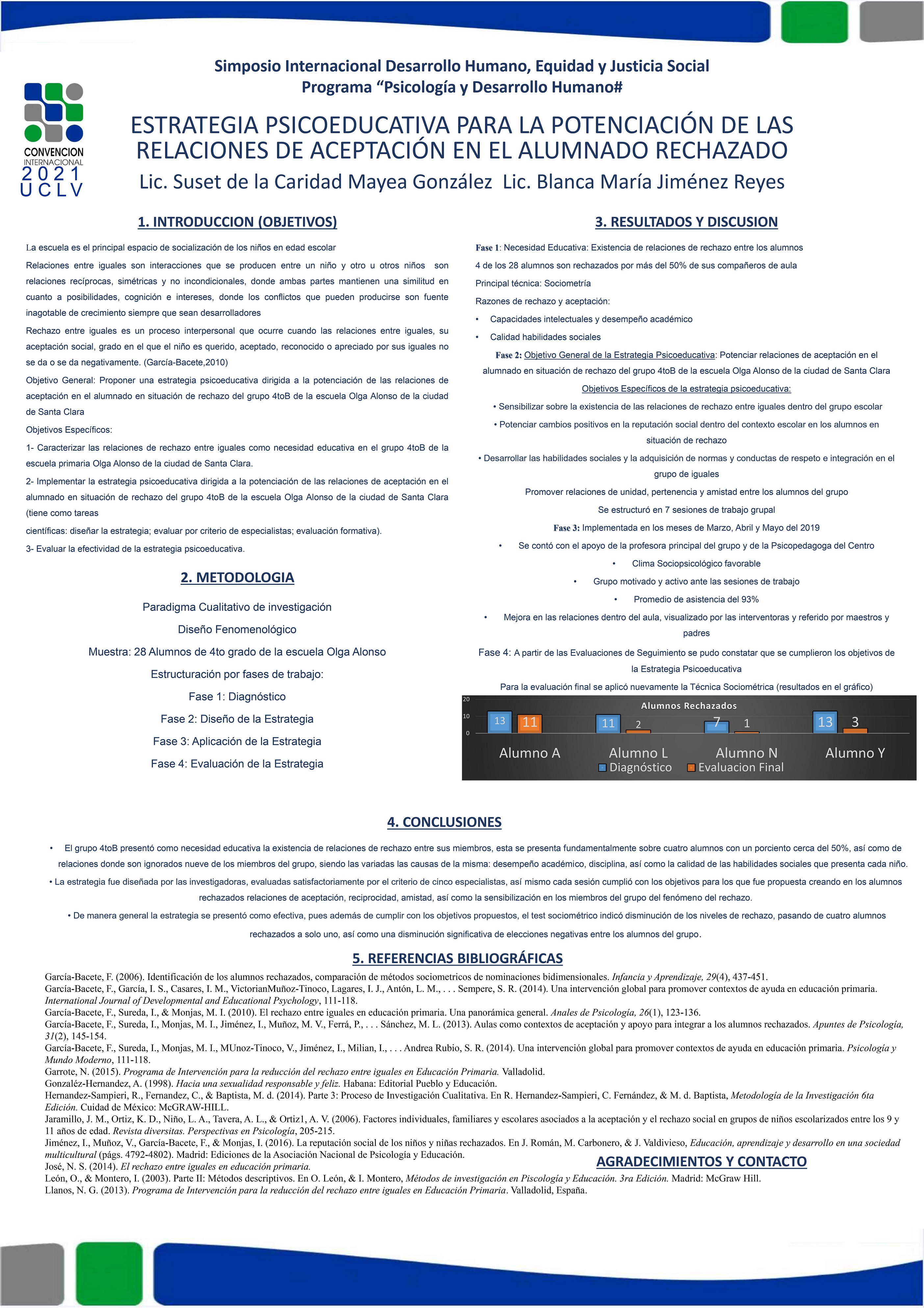 La investigación tiene como objetivo proponer una estrategia psicoeducativa para la potenciación de las relaciones de aceptación en el alumnado rechazado del grupo 4toB de la escuela “Olga Alonso” de Santa Clara. La muestra utilizada fueron los 29 alumnos del grupo. La investigación contó con 4 fases. Fase 1: diagnóstico realizado mediante el test sociométrico, entrevistas a la maestra y dinámicas grupales con los alumnos; obteniéndose como necesidad educativa las relaciones de rechazo entre iguales que afecta el proceso educativo. Fase 2: diseño de la estrategia psicoeducativa dirigida a potenciar relaciones de aceptación en el alumnado rechazado del grupo, mediante la sensibilización sobre el tema, el fomento del cambio positivo en las reputaciones sociales de los alumnos rechazados, la promoción de amistad y unidad entre alumnos y el desarrollo de habilidades sociales. Fase 3: realizaron 7 sesiones con técnicas de trabajo grupal. Fase 4: evidenciándose en la evaluación la disminución en las emisiones de rechazo dentro del grupo y el cambio en la posición de rechazados que tenían lo estudiantes al inicio en la actividad de juego y estudio; los escolares comprendieron las manifestaciones, causas y consecuencias del rechazo y vivenciaron experiencias y emociones positivas que fortalecieron la unidad grupal.