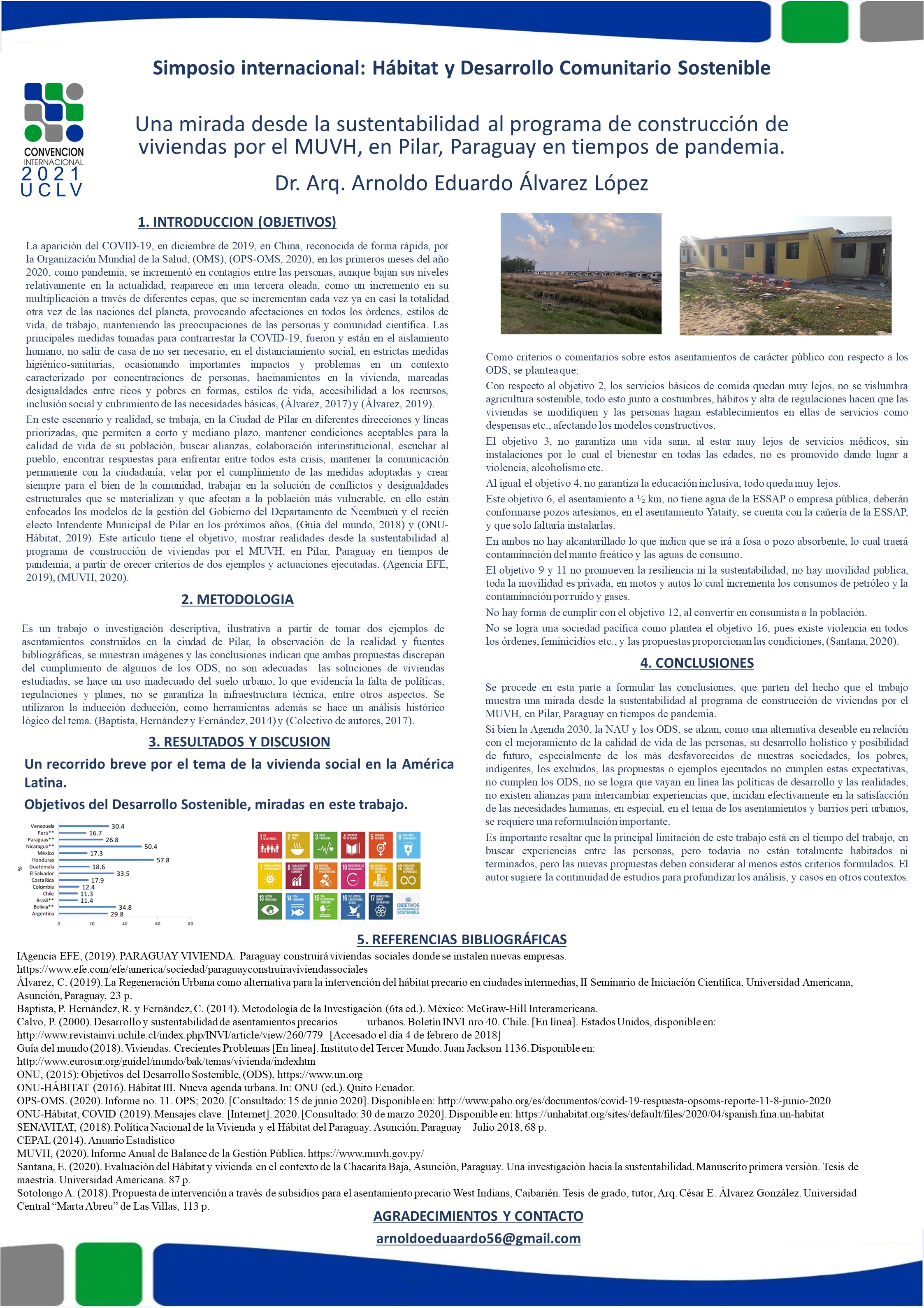 La ciudad de Pilar, llamada la Perla del Sur, es la capital del Departamento de Ñeembucú en Paraguay, distante 358 km de Asunción, la capital del país, ubicada a orillas del río Paraguay y del arroyo Ñeembucú, en la frontera con la República Argentina, caracterizada por un pueblo sencillo, con gente hospitalaria, con una rica historia, que trabaja y proyecta su futuro, en diferentes líneas de desarrollo, entre ellas el programa de la vivienda. Paraguay en su Informe a Hábitat III, plantea, garantizar una planificación y diseño urbanos sostenibles, y mejorar el acceso a una vivienda adecuada, (SENAVITAT, 2016 p. 16 y 48). El objetivo del trabajo es mostrar realidades entre los programas de viviendas del Ministerio de Urbanismo, Vivienda y Hábitat (MUVH), el cumplimiento de los Objetivos del Desarrollo Sostenible (ODS) y las politicas planteadas en el propio informe en tiempos de pandemia COVID 19. Es una investigación descriptiva, ilustrativa a partir de tomar dos ejemplos de asentamiento construidos en la ciudad de Pilar, la observación de la realidad y fuentes bibliográficas, se muestran imágenes y las conclusiones indican que ambas propuestas discrepan del cumplimiento de algunos de los ODS, no son adecuadas las soluciones de viviendas estudiadas, se hace un uso inadecuado del suelo urbano, lo que evidencia la falta de políticas, regulaciones y planes, no se garantiza la infraestructura técnica, entre otros aspectos.