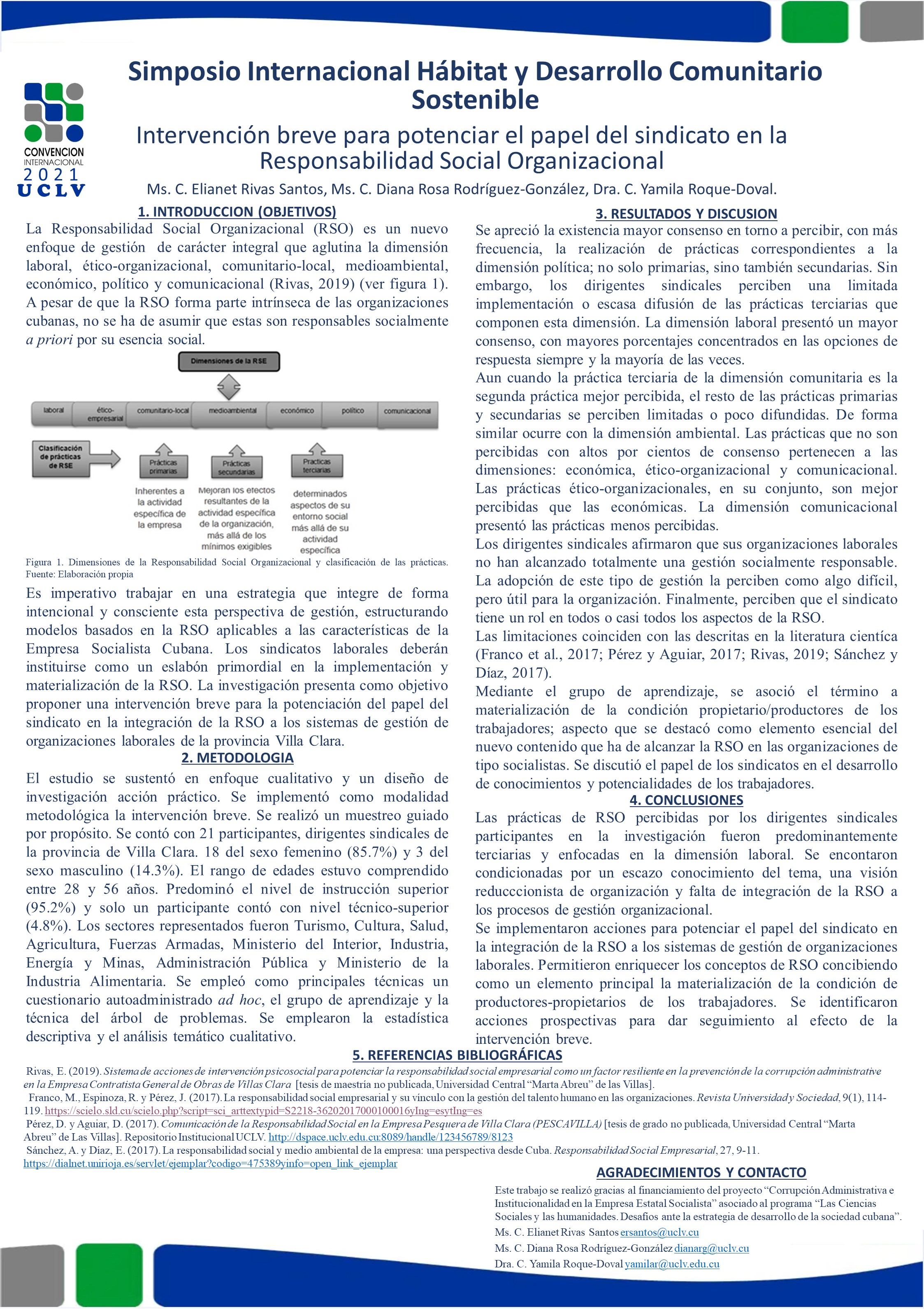 La investigación propuso una intervención breve para potenciar el papel del sindicato en la integración de la Responsabilidad Social Organizacional a los sistemas de gestión de organizaciones laborales de la provincia Villa Clara. Se siguió un enfoque cualitativo y un diseño de investigación acción práctico. Se realizó un muestreo intencional. Se emplearon como instrumentos un cuestionario autoadministrado ad hoc, el grupo de aprendizaje y la técnica del árbol de problemas. Para el análisis de datos se emplearon la estadística descriptiva y el análisis temático cualitativo. Se comprobó que las prácticas de Responsabilidad Social Organizacional percibidas son predominantemente terciarias y enfocadas a la dimensión laboral; condicionado por escaso conocimiento del tema. Mediante la intervención breve se potenció una comprensión amplia sobre Responsabilidad Social Organizacional que concibe como su elemento central la realización de la propiedad social. Se promovió el papel fundamental del sindicato para fomentar su conocimiento en los trabajadores.