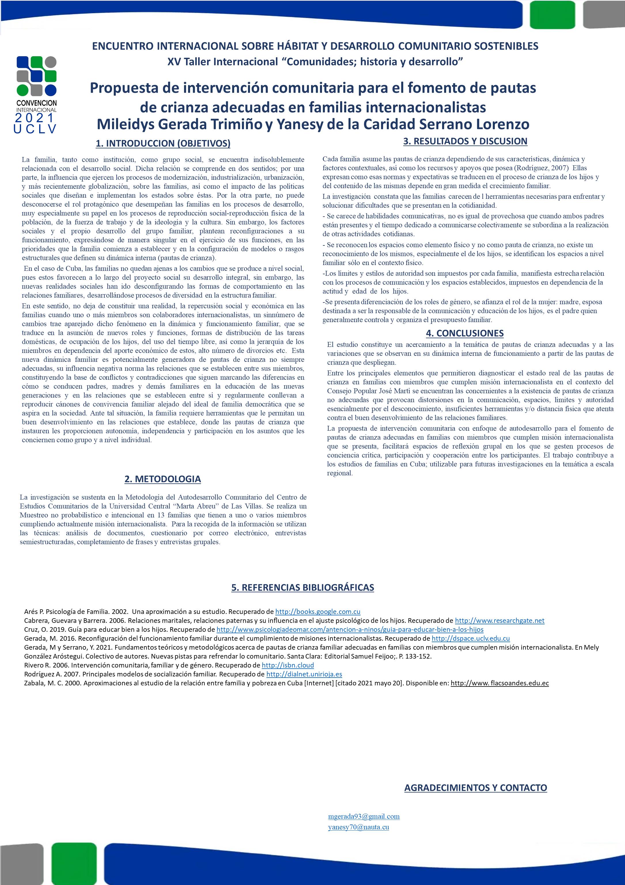 La nueva dinámica familiar que se presenta cuando en la familia alguno de sus miembros cumple misión internacionalista, es potencialmente generadora de pautas de crianza no siempre adecuadas, su influencia negativa norma las relaciones que se establecen entre sus miembros, constituyendo la base de conflictos y contradicciones que siguen marcando las diferencias en cómo se conducen padres, madres y demás familiares en la educación de los hijos y en las relaciones que se establecen entre sí y regularmente conllevan a reproducir cánones de convivencia familiar alejado del ideal de familia democrática que se aspira en la sociedad. En este sentido el presente trabajo expone un proyecto de intervención comunitaria con enfoque de autodesarrollo que contribuya al fomento de pautas de crianza adecuadas en familias con miembros que cumplen misión internacionalista del Consejo Popular José Martí de Santa Clara. Los métodos de los niveles teórico y empírico se articulan desde la perspectiva cuantitativa-cualitativa, el analítico-sintético, histórico-lógico e inductivo-deductivo del conocimiento teórico. La investigación contribuye a diagnosticar el estado real de las pautas de crianza en familias con miembros que cumplen misión internacionalista concerniente a pautas de crianza no adecuadas que provocan distorsiones en la comunicación, espacios, límites y autoridad esencialmente por el desconocimiento, insuficientes herramientas y/o distancia física que atenta contra el buen desenvolvimiento de las relaciones familiares. La propuesta de intervención comunitaria con enfoque de autodesarrollo que se presenta facilita espacios de reflexión grupal en los que se gesten procesos de conciencia crítica, participación y cooperación entre los participantes.